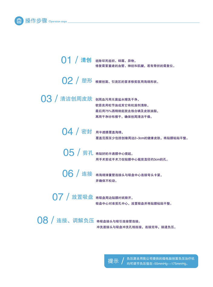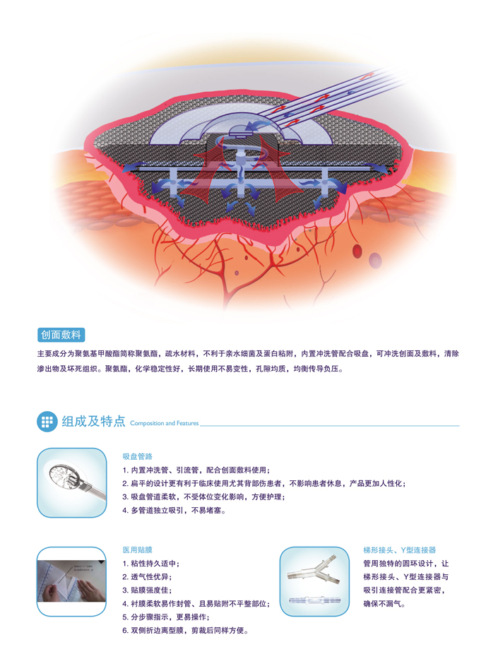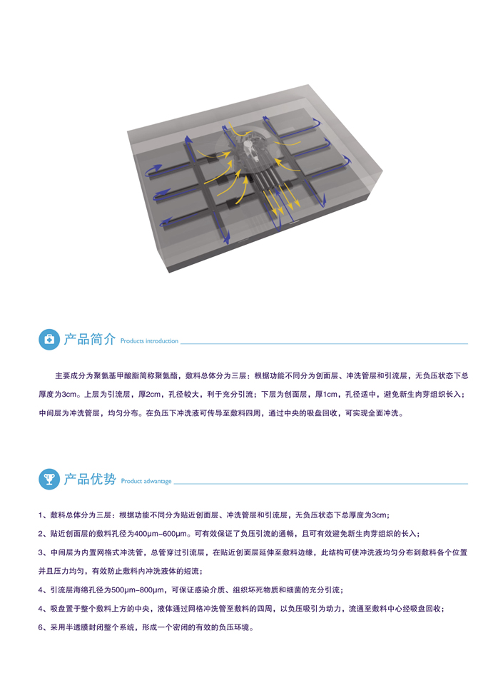 主要成分為聚氨基甲酸酯簡稱聚氨酯,敷料總體分為三層:根據功能不同分為創面層、沖洗管層和引流層,無負壓狀態下總厚度在3cm。上層為引流層,厚2cm,孔徑較大,利于充分引流;下層為創面層,厚1cm,孔徑適中,避免新生肉芽組織長入;中間層為沖洗管層,均勻分布。在負壓下沖洗液可傳導至敷料四周,通過中央的吸盤回收,可實現全面沖洗。